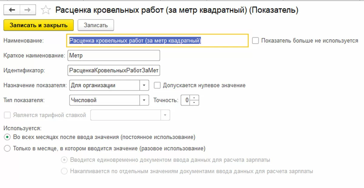 Для ввода данных по выполненным работам тоже нужно ввести показатели. Приведу показатель, в который будет вводиться площадь перекрытой кровли: