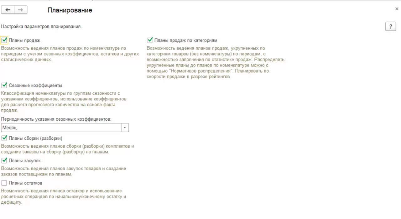 Настройка в системе параметров планирования включает в себя возможности ведения планов продаж по номенклатуре и без номенклатуры (укрупненно по категориям товаров), с учетом сезонных коэффициентов, заполнение документов планирования запасов по статистическим данным, а также ведение планов сборки (разборки) комплектов, планов закупки товаров для создания по планам заказов поставщикам.