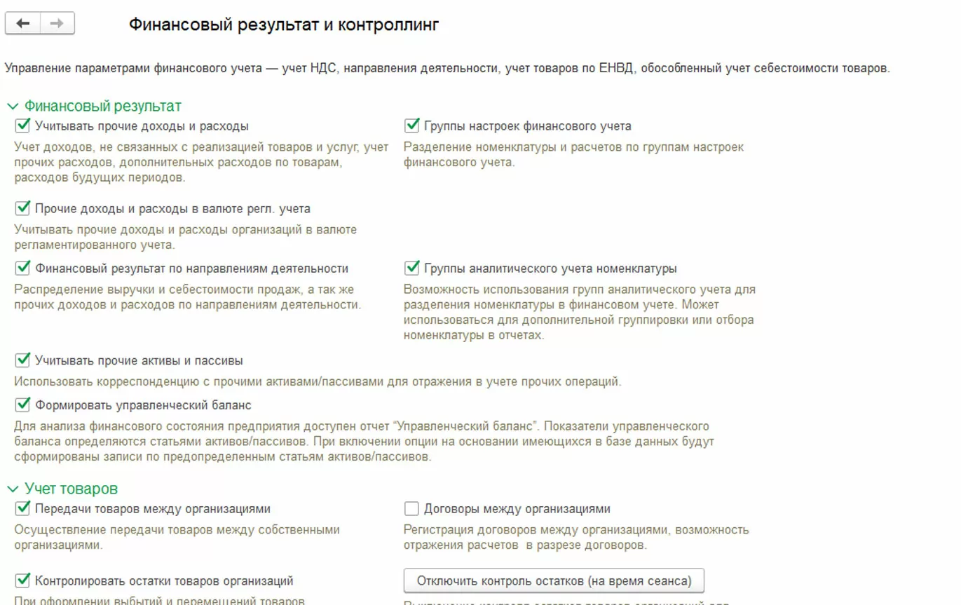В разделе производится настройка параметров финансового учета: учет НДС и направления деятельности. В торговой организации могут выделяться такие направления деятельности, как оптовые продажи, розничные продажи, продажа дистрибьюторам и пр. Для организации учета по направлениям деятельности задают способы распределения доходов. При создании способов указывают одно из существующих правил распределения. В данном разделе 1С Управление торговлей 11.4 (УТ 11) устанавливается признак «Формировать управленческий баланс». Такой вид баланса представляет собой упрощенную форму бухгалтерского баланса и служит для оценки финансовой эффективности предприятия. Он позволяет управлять активами и обязательствами, контролировать направления использования финансовых ресурсов, включает данные финансовой отчетности.