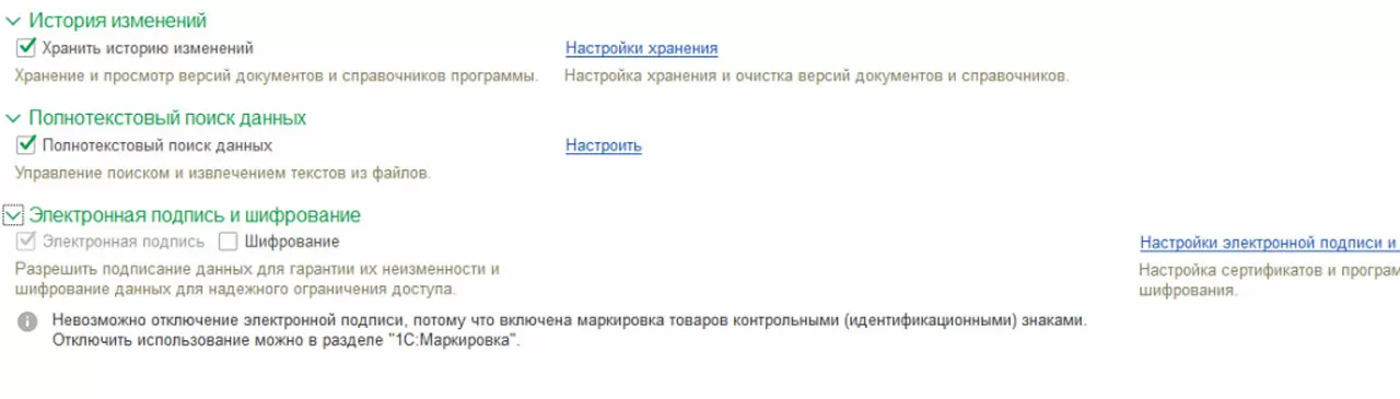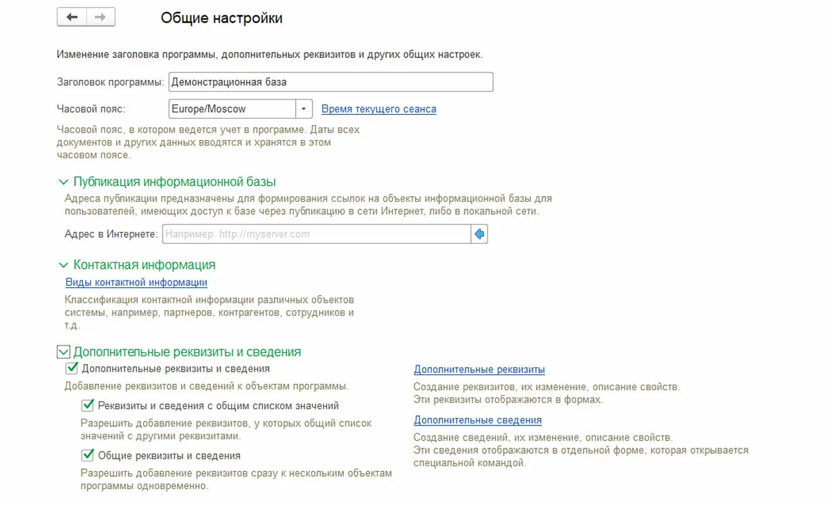 На данной вкладке можно выполнить настройку часового пояса, указать виды контактной информации различных объектов системы и возможность использования дополнительных реквизитов и сведений, настроить хранение истории изменений документов и справочников программы, а также полнотекстовый поиск данных, и разрешить использование электронной цифровой подписи.