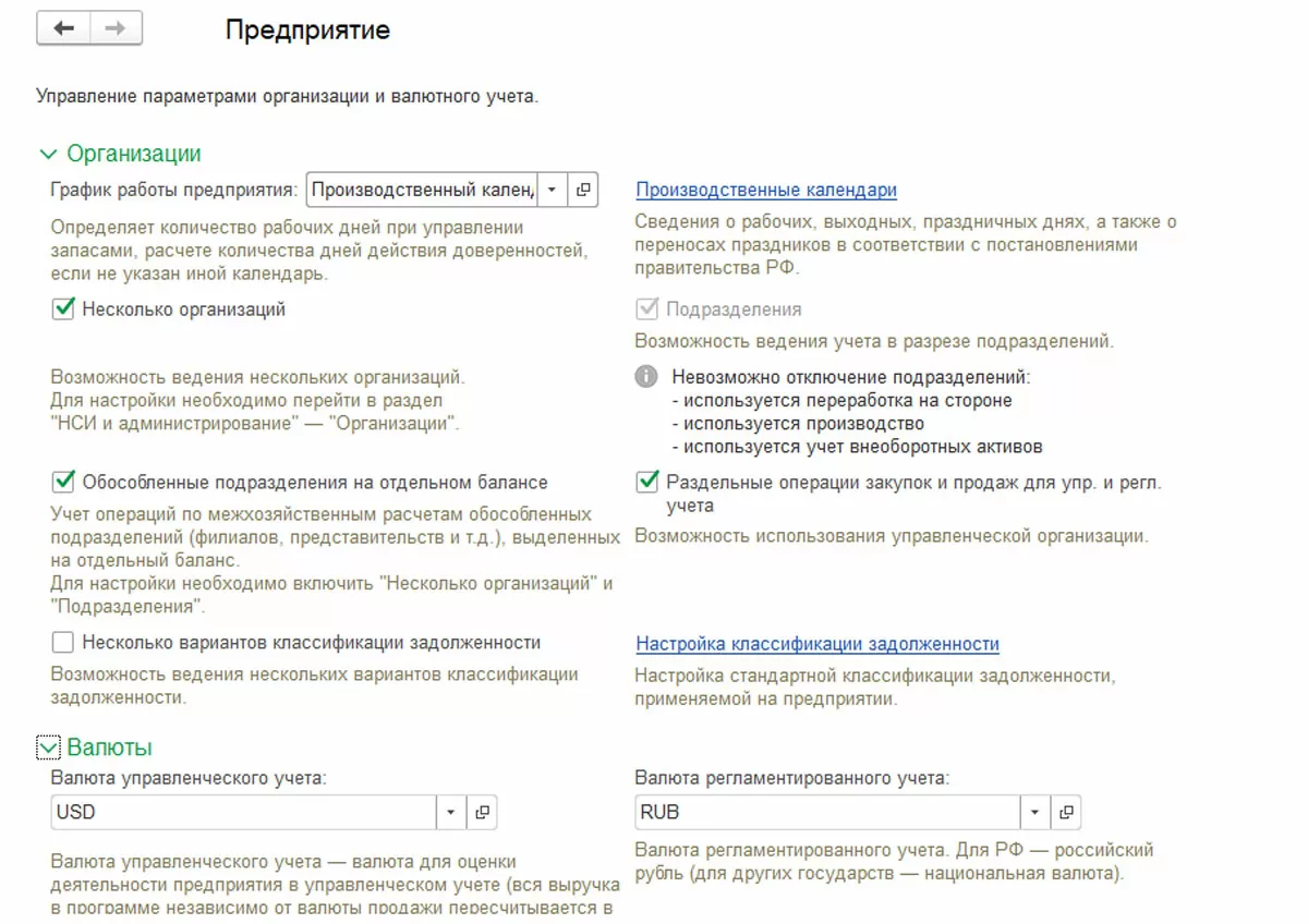 Графики формируются на основе производственных календарей. Можно использовать графики работы и для предприятия в целом, и для его подразделений (например, график работы склада). Компании, у которой имеется несколько юридических лиц, для корректного учета в 1С следует установить признак учета по нескольким организациям, для возможности ведения учета в разрезе подразделений установить признак «Подразделения» и, если надо, активировать раздельное ведение управленческого и регламентированного учета.