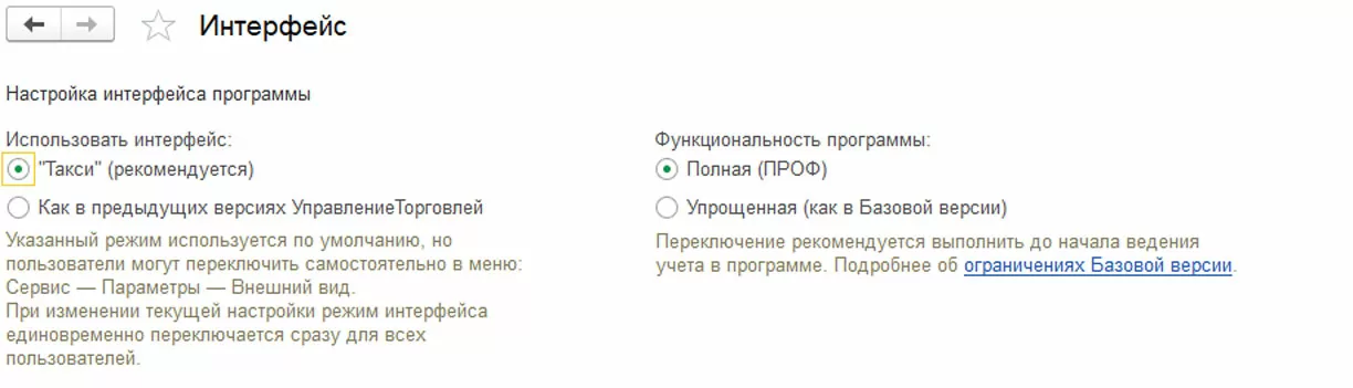 Функциональность программы (полную или упрощенную) и вид Интерфейса можно выбрать в группе «НСИ и администрирование» в разделе «Администрирование-Интерфейс».