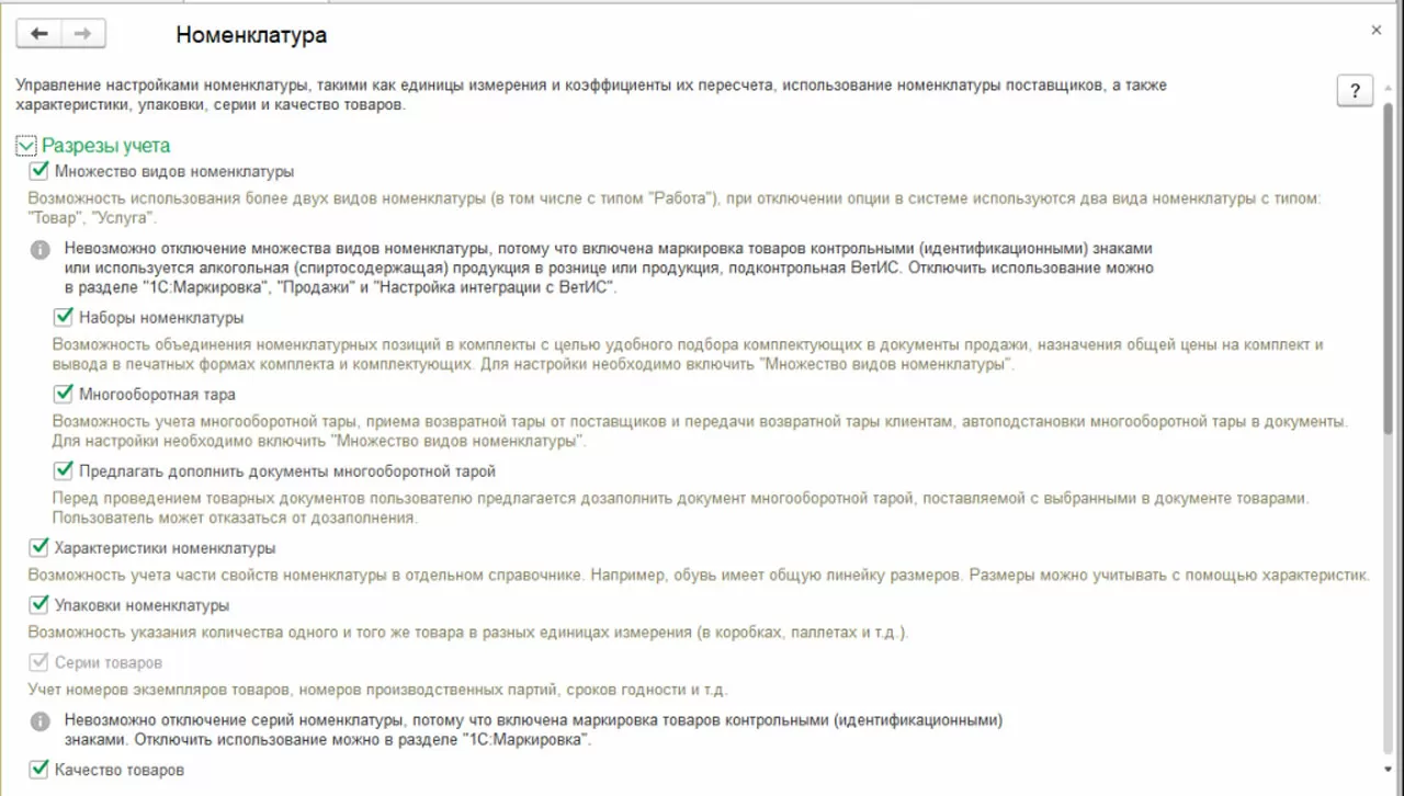 Если сделать активной настройку «Наборы номенклатуры при продаже», то в 1С можно будет создавать комплекты номенклатур для последующей продажи. Можно настроить учет, прием и передачу многооборотной тары, а также автоподстановку тары в документы.