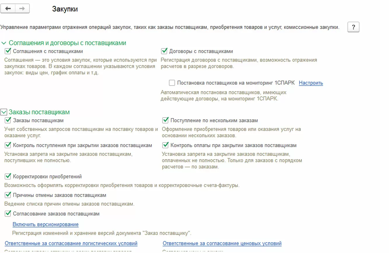 В данном разделе производится настройка параметров документов, связанных с операциями закупок – соглашений с поставщиками и договоров.