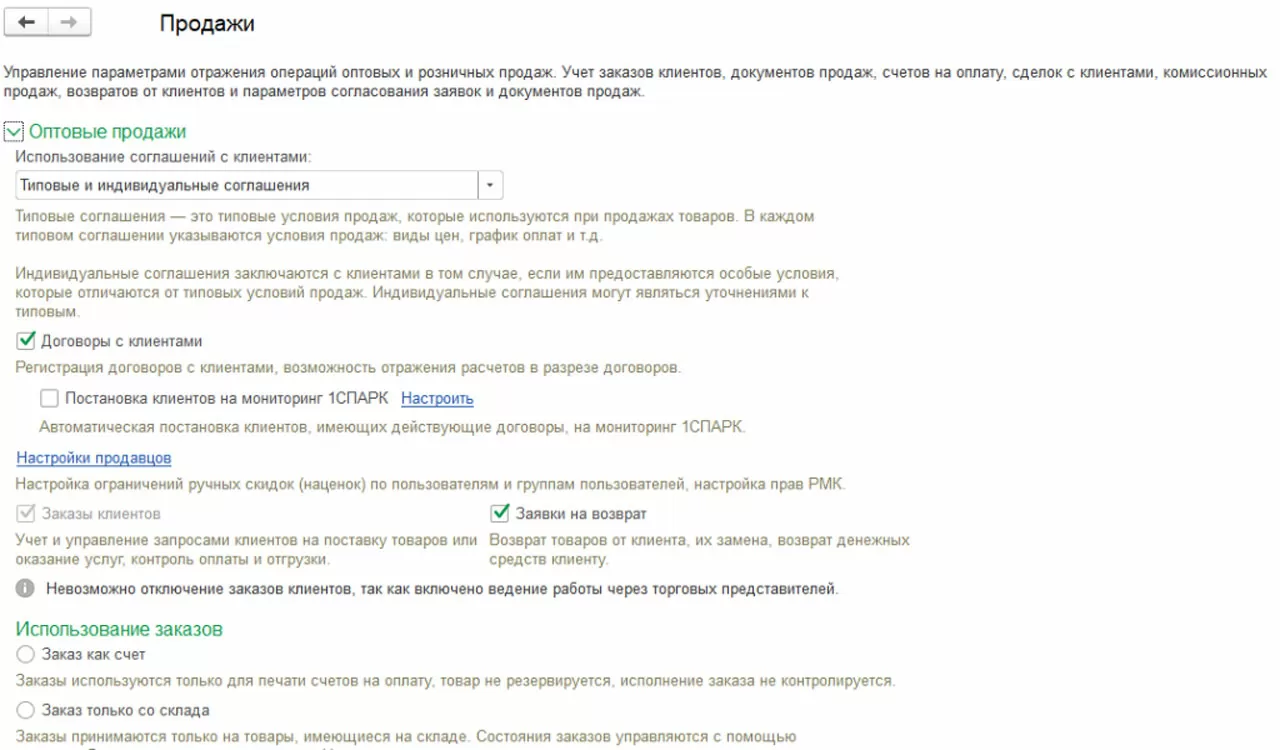 В разделе выполняется настройка заказов клиентов. Устанавливаем признак «Заказы клиентов», после чего выбираем один из вариантов использования:
