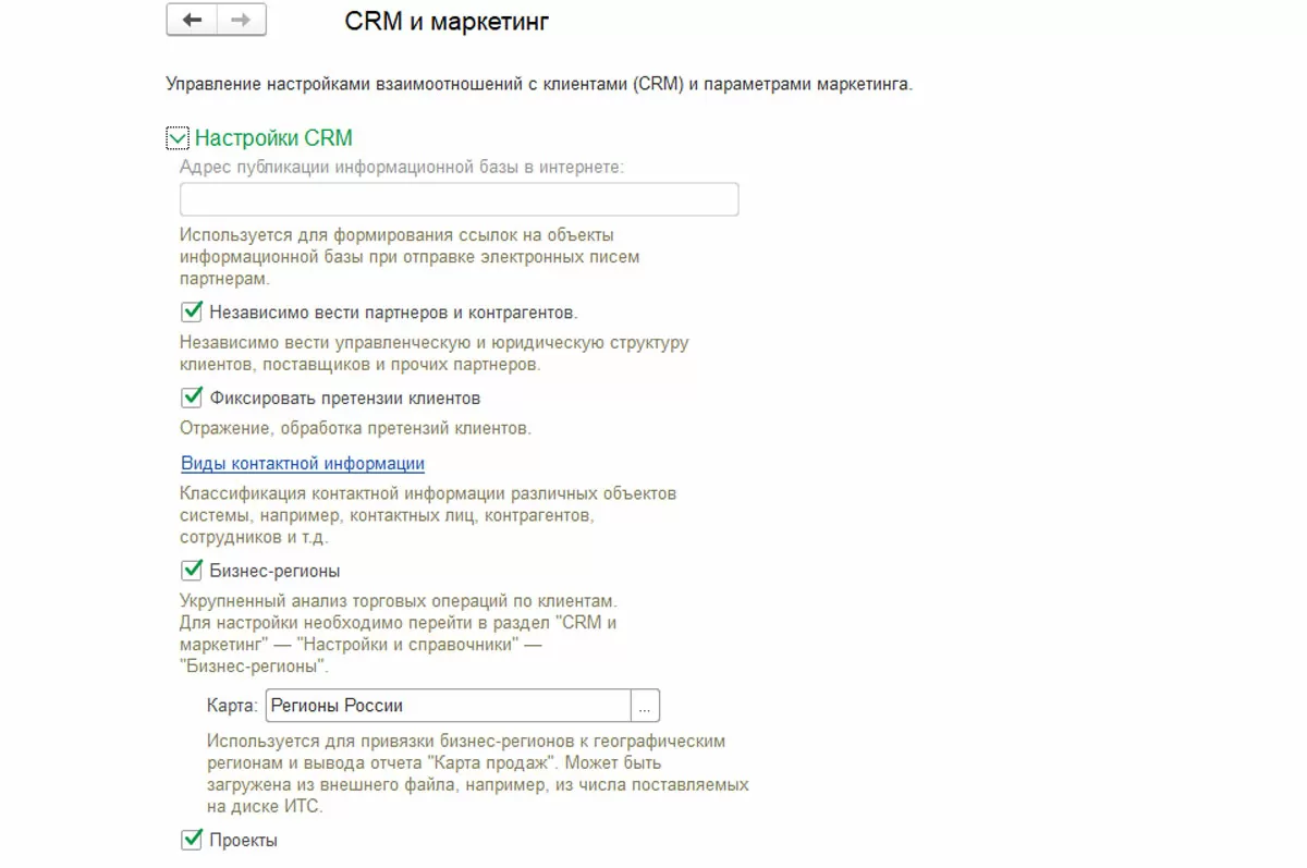Можно вести укрупненный анализ торговых операций по клиентам. Для настройки бизнес-регионов переходим в раздел «CRM и маркетинг-Настройки и справочники-Бизнес регионы».