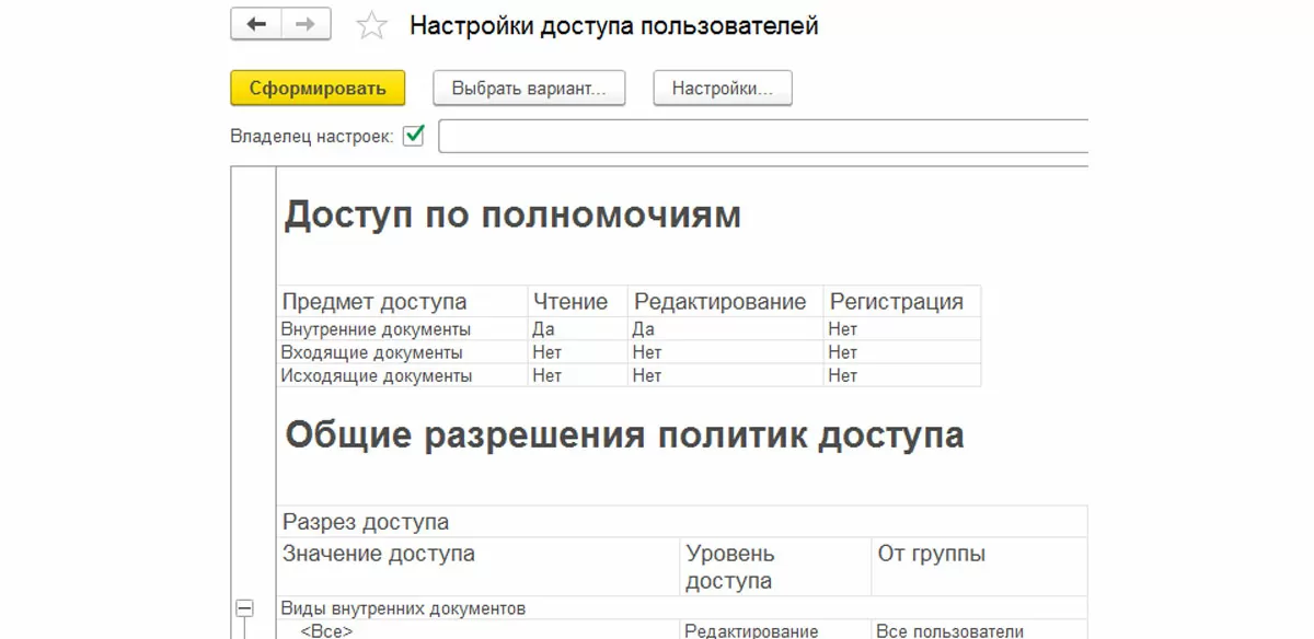 Права настраивает администратор базы или пользователь программы с соответствующей ролью. Права каждого объекта формируются как совокупность этих настроек. В зависимости от их состава результат настройки будет различен для каждого сотрудника компании (или группы сотрудников). Рассмотрим настройки ПД на примере программы 1С для автоматизации документооборота.