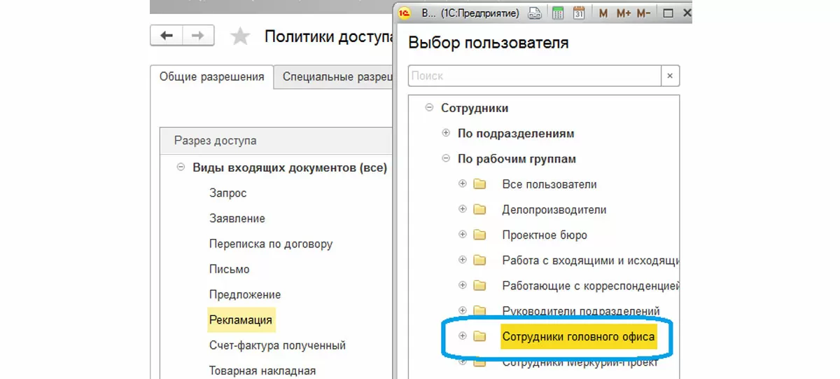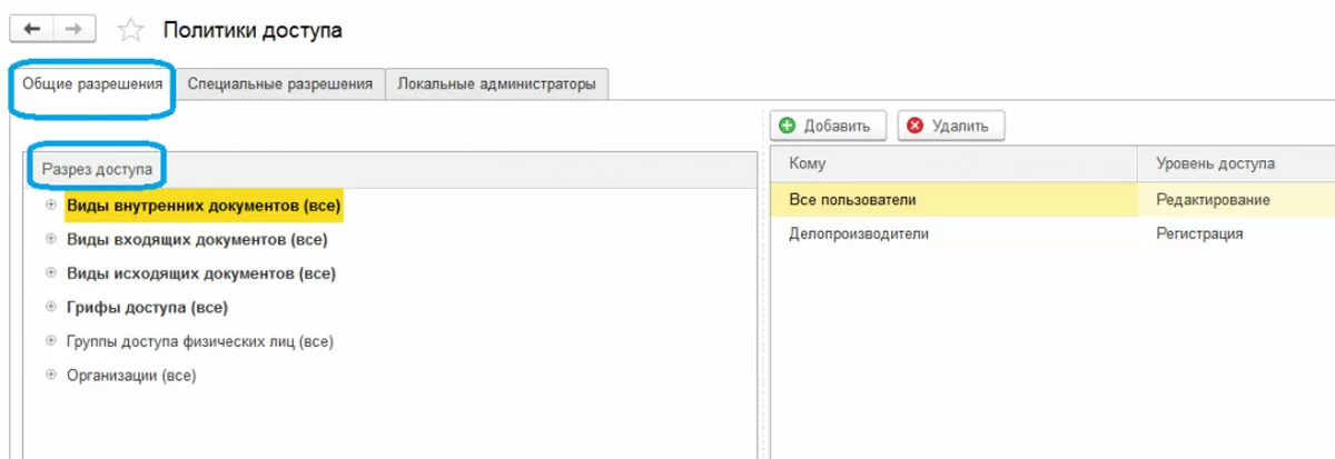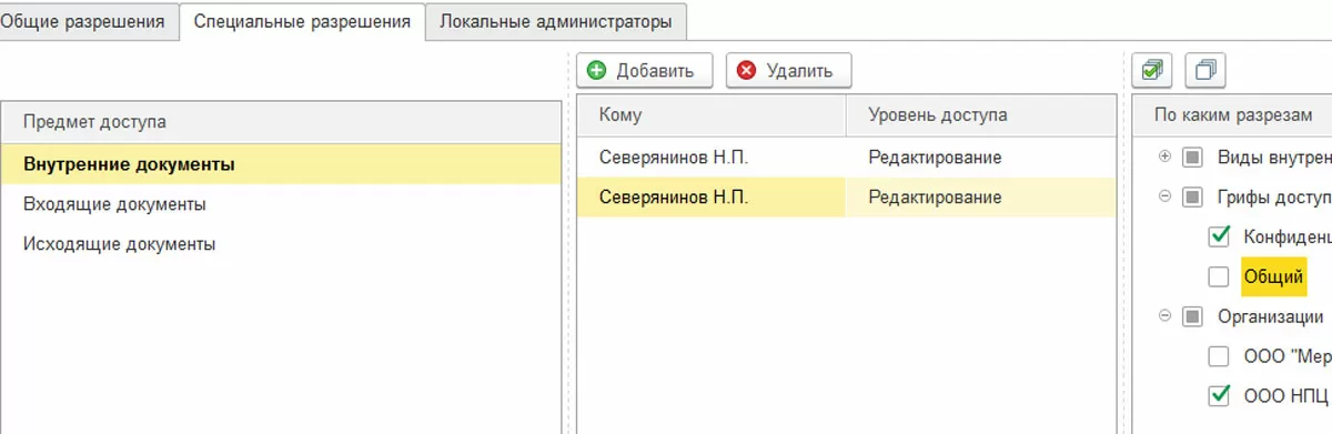 Общие разрешения в 1С позволяют быстро сделать настройку по разрезам доступа к документам в базе. Специальные разрешения дают персонифицированные права доступа к документам и более соответствуют должностным обязанностям конкретного сотрудника компании.