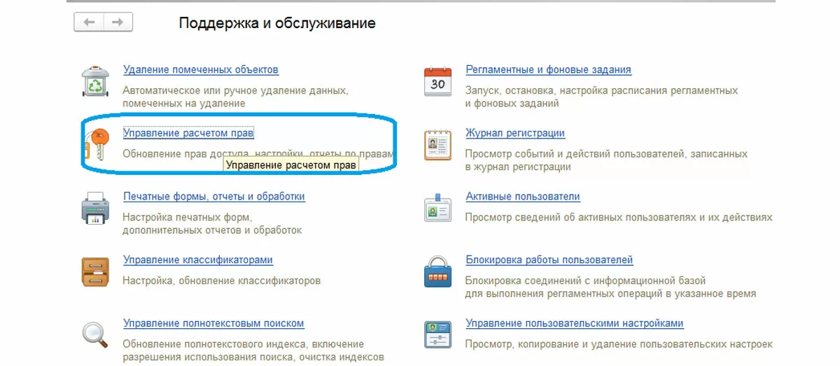 Количество разрезов, которые используются в политиках, в случае необходимости можно изменить. Для этого перейдем в меню 1С «Поддержка и обслуживание/Управление расчетом прав».