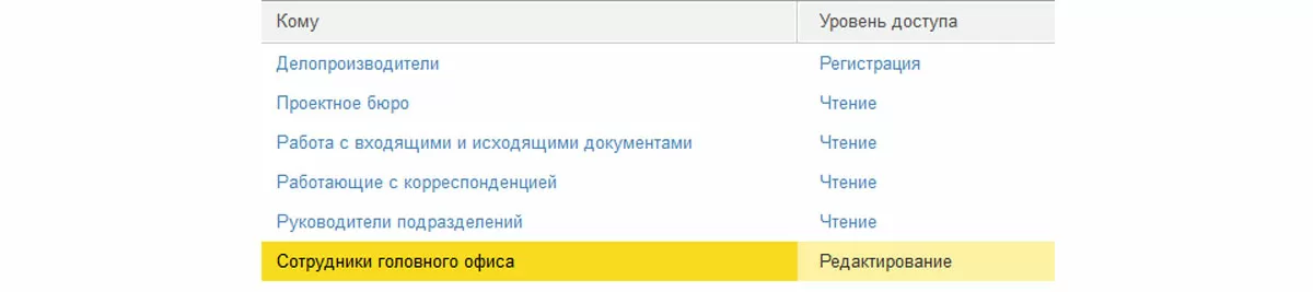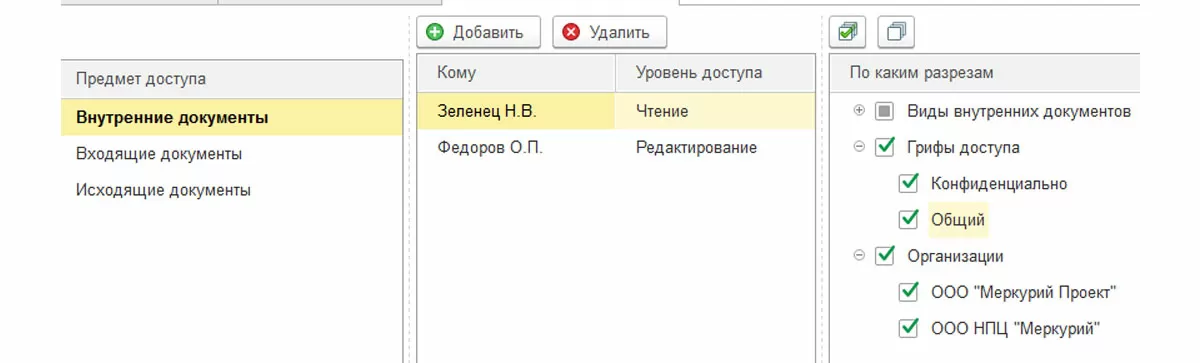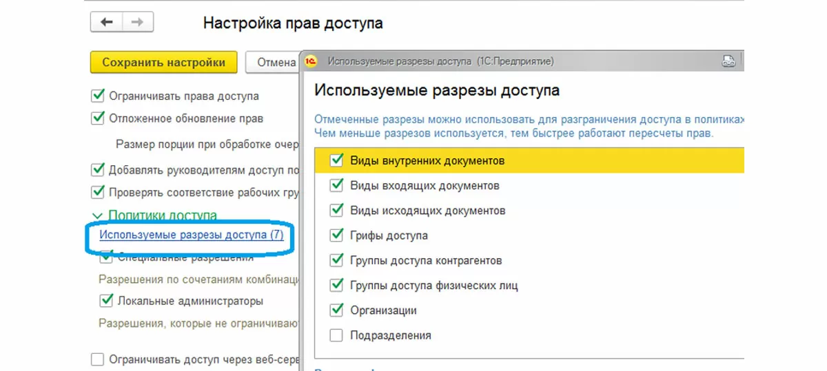 Обратите внимание! Выбор небольшого количества разрезов доступа ускоряет пересчет прав. При изменении настроек в 1С программа заново пересчитывает объекты, круг ПД которых был расширен либо сужен. Этот процесс в 1С Документооборот может занять довольно продолжительное время. Поэтому мы рекомендуем менять эту настройку на начальном этапе пользования программой.