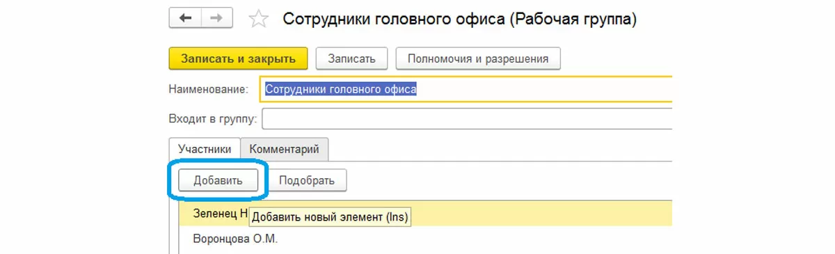 В окне справочника «Рабочие группы» добавляем новый элемент под наименованием «Сотрудники головного офиса».