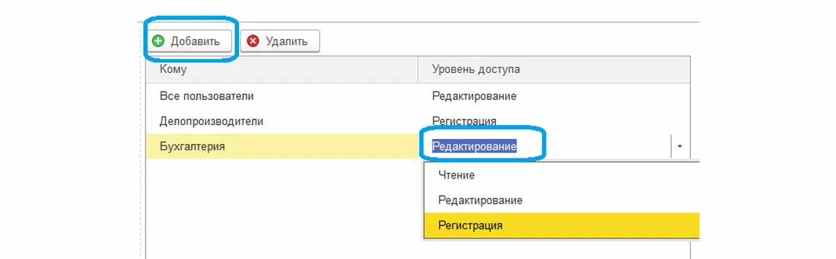 Для пользователей программы 1С существуют три уровня доступа: чтение, редактирование и регистрация. Последний уровень (регистрация) наделяет пользователя самым обширным кругом полномочий, которые включают первые 2 уровня. Редактирование разрешает читать, изменять, удалять и добавлять контент в документ.