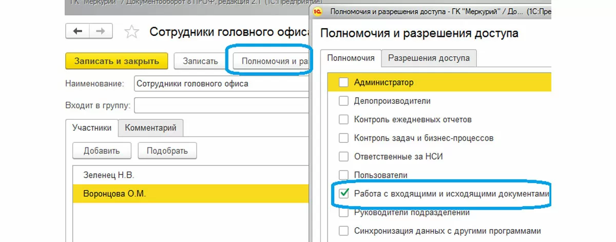 Полномочия – это самое крупное деление ПД в 1С Документооборот, представляющее собой готовый набор ролей. С их помощью определяются, какие типы данных будут видны пользователю программы. Все остальные настройки ограничивают эти права.