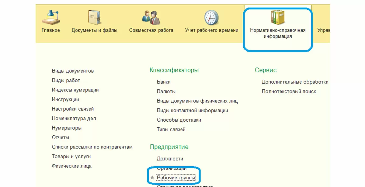 Для этого переходим в меню «Нормативно-справочная информация/Рабочие группы».