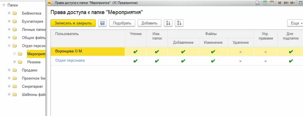 Мгновенно настроить права доступа в 1С возможно путем добавления сотрудника в рабочую группу. Это влечет отмену настроек политик и прав на папки.