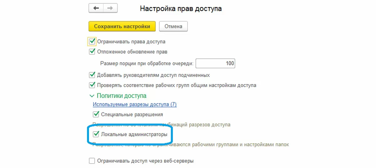 Получение пользователем статуса локального администратора в 1С позволяет ему иметь доступ к документам, содержащимся в папках, независимо от рабочей группы. К примеру, начальнику юридического отдела можно назначить неограниченный доступ на чтение любых договоров компании. При этом назначенный локальным администратором сотрудник получит права на любой документ папки, даже не являясь членом рабочей группы. Данная функция включается путем отметки галочки в соответствующем флажке (в «квадратике» Локальные администраторы).