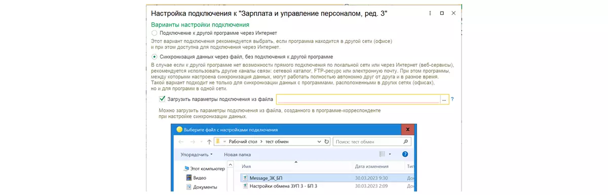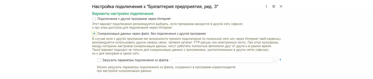При использовании обмена через файл у баз может вообще не быть выхода в интернет. Файл обмена выгружается в установленную папку, а затем из нее загружается в программу-приемник. Также файл может быть перенесен с помощью накопителя.
