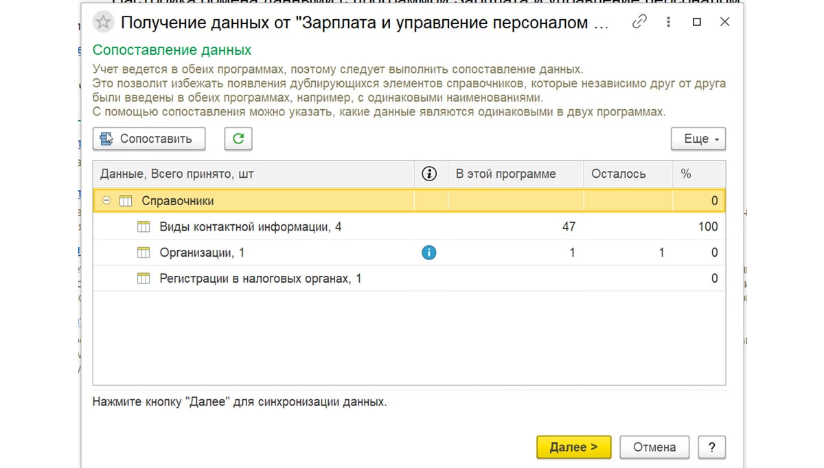 При первичной загрузке система выполнит сопоставление данных. На экране появиться окно сопоставления. Система укажет количество новых данных. Покажет, что удалось сопоставить, а что необходимо создать в программе–получателе.