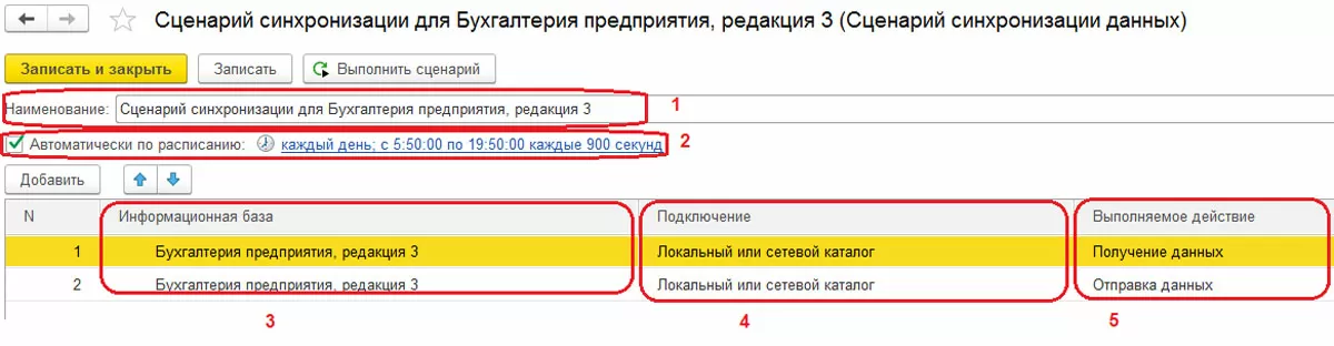 Синхронизацию можно настроить по расписанию, после чего системы будут обмениваться данными автоматом. Для этого настраиваем сценарий синхронизации (рис.16). Рассмотрим порядок его заполнения: