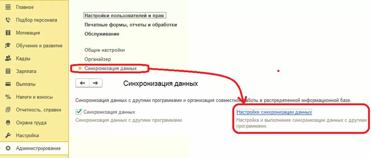 Теперь перейдем к настройкам синхронизации рассматриваемых решений 1С. Всего несколько шагов отделяют нас от консолидации данных и правильной одновременной работы двух систем. Начнем с 1С:ЗУП - 1С:Зарплата и управление персоналом.
