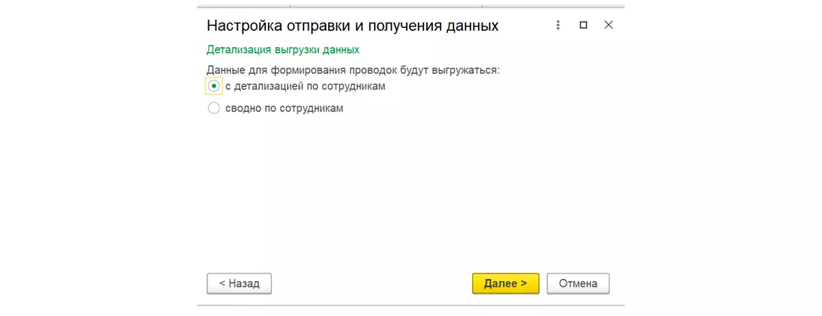 На этом этапе необходимо выбрать список организаций, участвующих в обмене, и способ выгрузки данных. Данные можно выгружать с детализацией по сотрудникам либо сводно.
