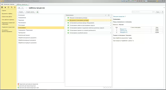 Процесс, реализованный в программе, можно использовать как самостоятельный процесс для согласования договоров перед их подписанием, а также заявок на оплату или закупку ТМЦ перед их оплатой (в отдельных случаях ежедневной «рутины» может быть даже настроено автоматическое согласование), так и в качестве элемента комплексного процесса для сложной многошаговой обработки документов.