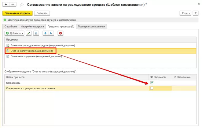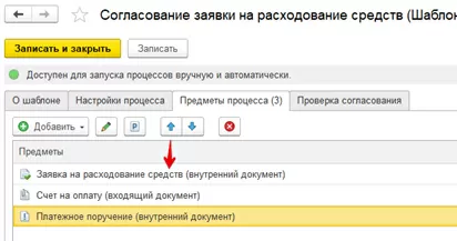 На третьей вкладке настройки шаблона маршрута согласования можно настроить предметы процесса.