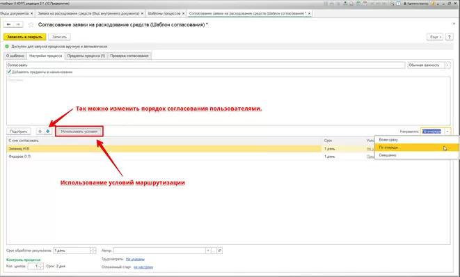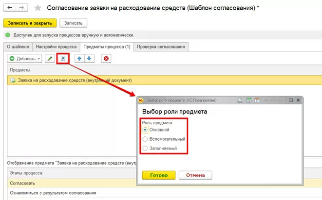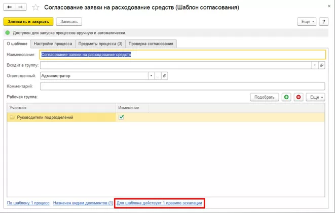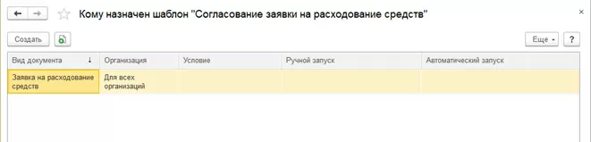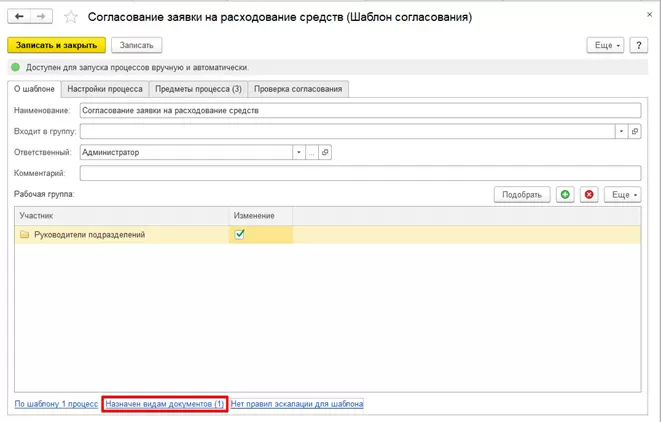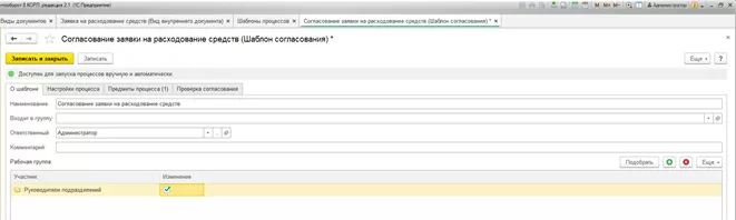 Попробуем создать новый шаблон процесса на примере согласования документа «Заявка на расходование средств», а также построить маршрут согласования заявки в 1С.