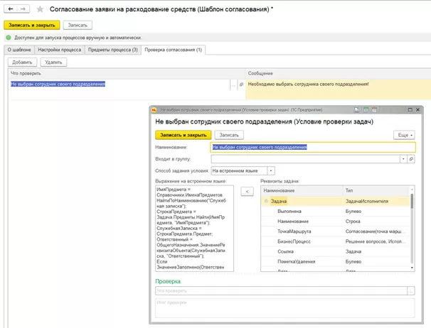 На последней вкладке настройки маршрута согласования можно настроить проверку условия, при соблюдении которого пользователь сможет выполнить свою задачу. Настройка условий схожа по своей сути с настройкой условий маршрутизации.