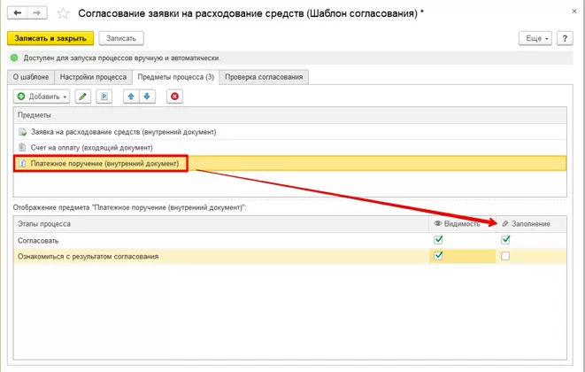 Для заполняемого предмета процесса здесь настраивается шаг процесса, на котором от пользователя потребуется заполнений данного предмета: