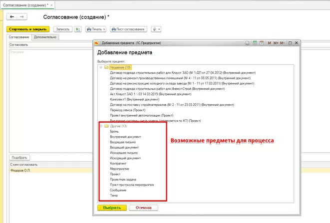 Это относится не только к документам, например, согласованию приказа, согласовывать можно отдельные файлы, а также проведение мероприятий, заведение контрагентов для использования в системе и проектов, отдельные проектные задачи и многие другие объекты системы.