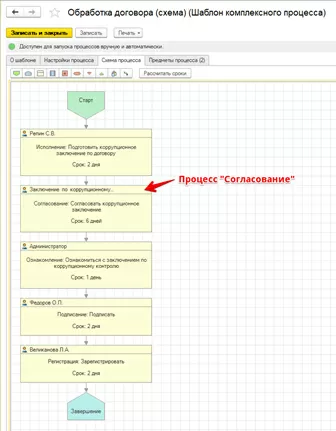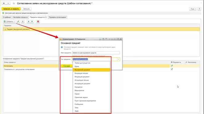 - Основной предмет – в результате исполнения процесс будет изменять статус у документа – согласован, не согласован, согласован с замечаниями;