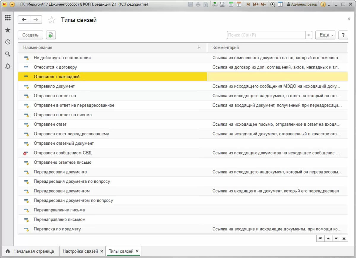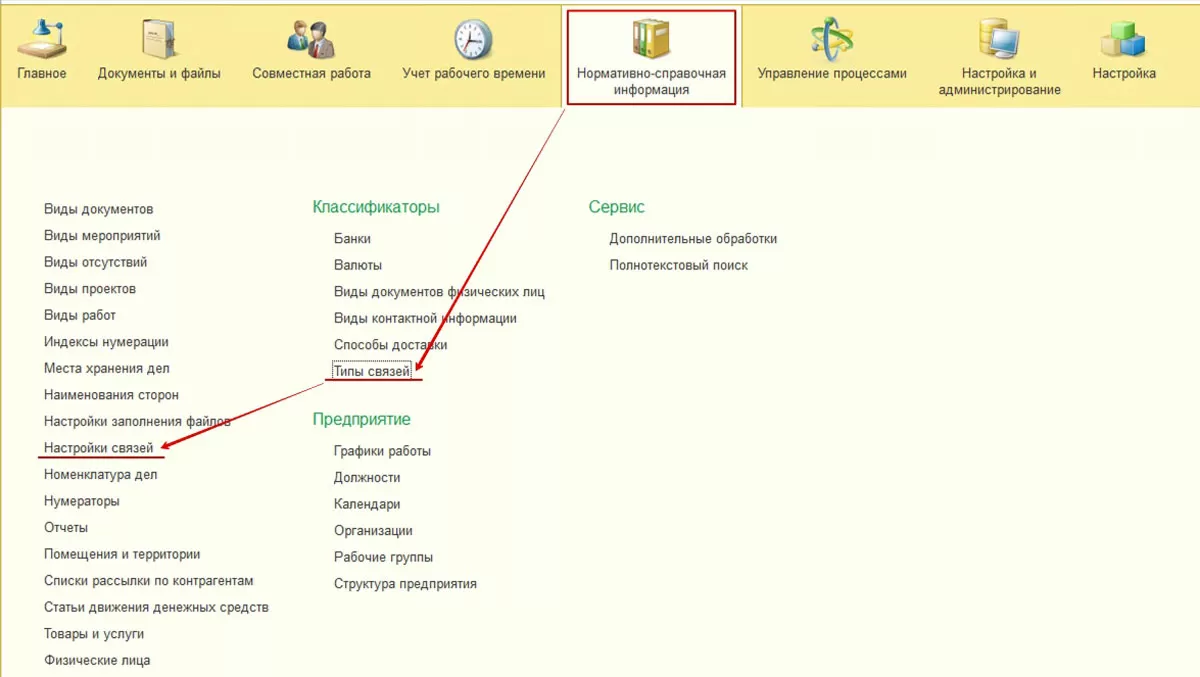 Для настройки связей документов используются справочник «Типы связей», который находится в разделе «Нормативно-справочная информация» и регистр сведений «Настройка связей». В него можно перейти из того же раздела «Нормативно-справочная информация» и из карточки элемента справочника «Типы связей».