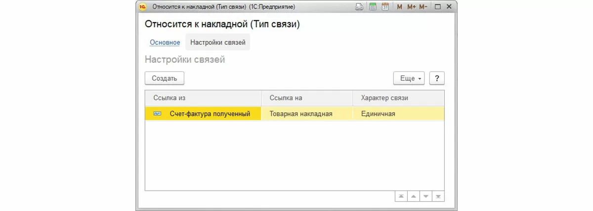 Здесь указан тип связи «Относится к накладной», установлено, что она Единичная, а также указан конкретный вид документа «Счет-фактура полученный», в данном случае входящего, для которого действует данный тип связи.