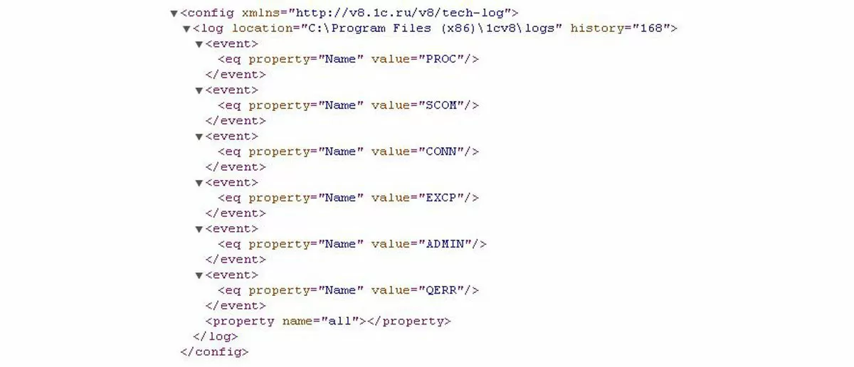 - Property – указанное значение в свойстве name отражает настройку, отвечающую за набор событий, попадающих в технологический журнал.