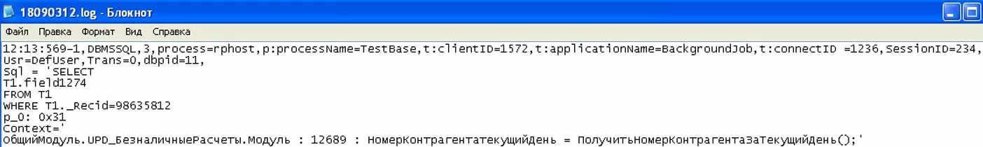 - Usr=DefUser,Trans=0,dbpid=11 – имя пользователя, показатель открытой или закрытой транзакции и идентификатор связи сервера приложений 1С с сервером БД;