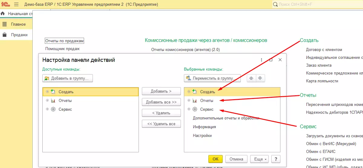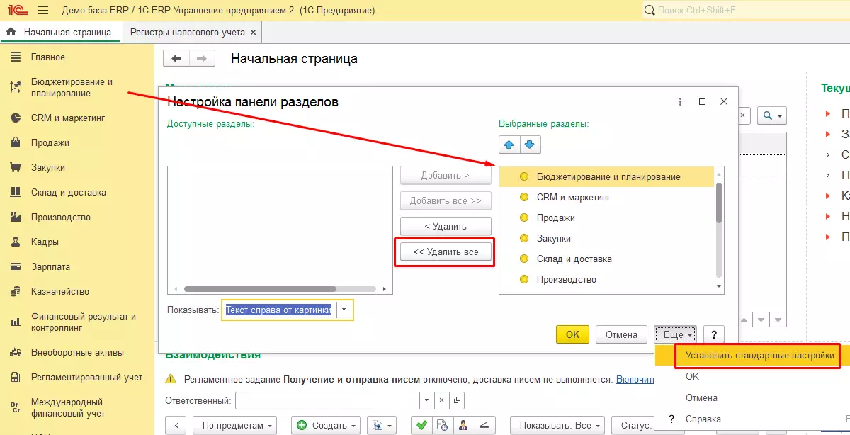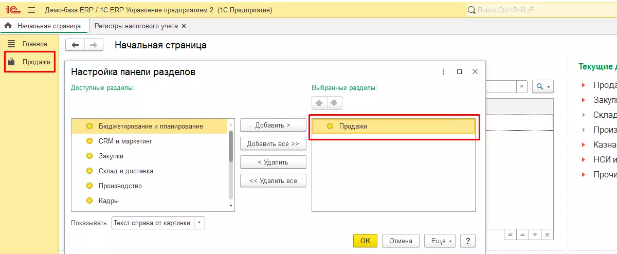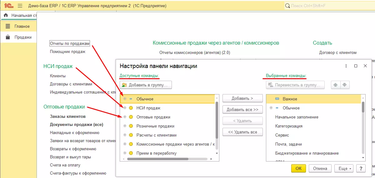 Моя практическая рекомендация включать сразу все настройки. Для этого добавляем их все на объекте системы Добавить все. И у вас полностью будут включены все разделы системы и все гиперссылки, которые позволяют вызвать все необходимые объекты в рамках разделов. Когда уже освоитесь в части управления системой, то можно либо вернуться к стандартном настройкам, либо сделать индивидуальный настройки под ваши рабочие цели.