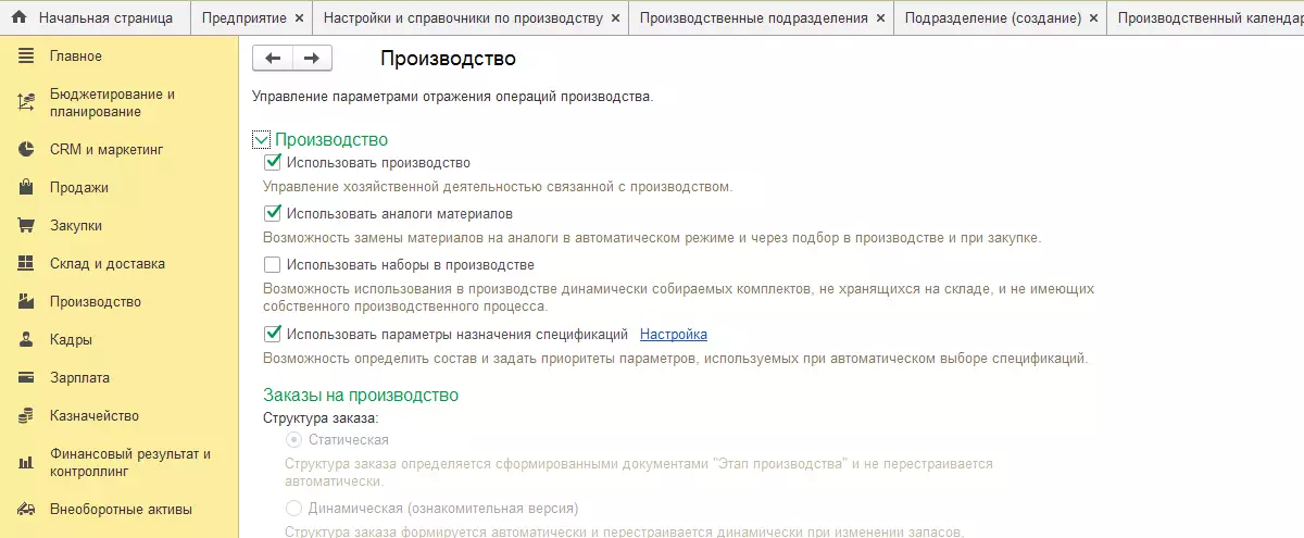 В случае, если организация осуществляет производственную деятельность, то в 1С:ERP 2.5 необходимо включить опцию Использовать производство в разделе НСИ и администрирование – Настройка НСИ и разделов – Производство.