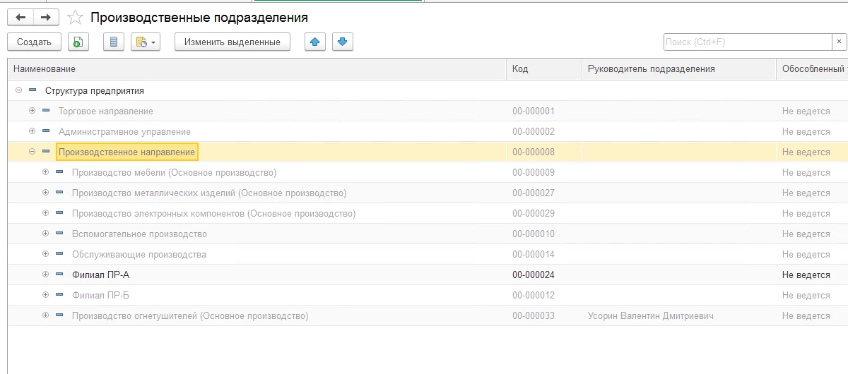 Подразделения, которые не участвуют в производстве продукции в справочнике выделены бледным цветом.