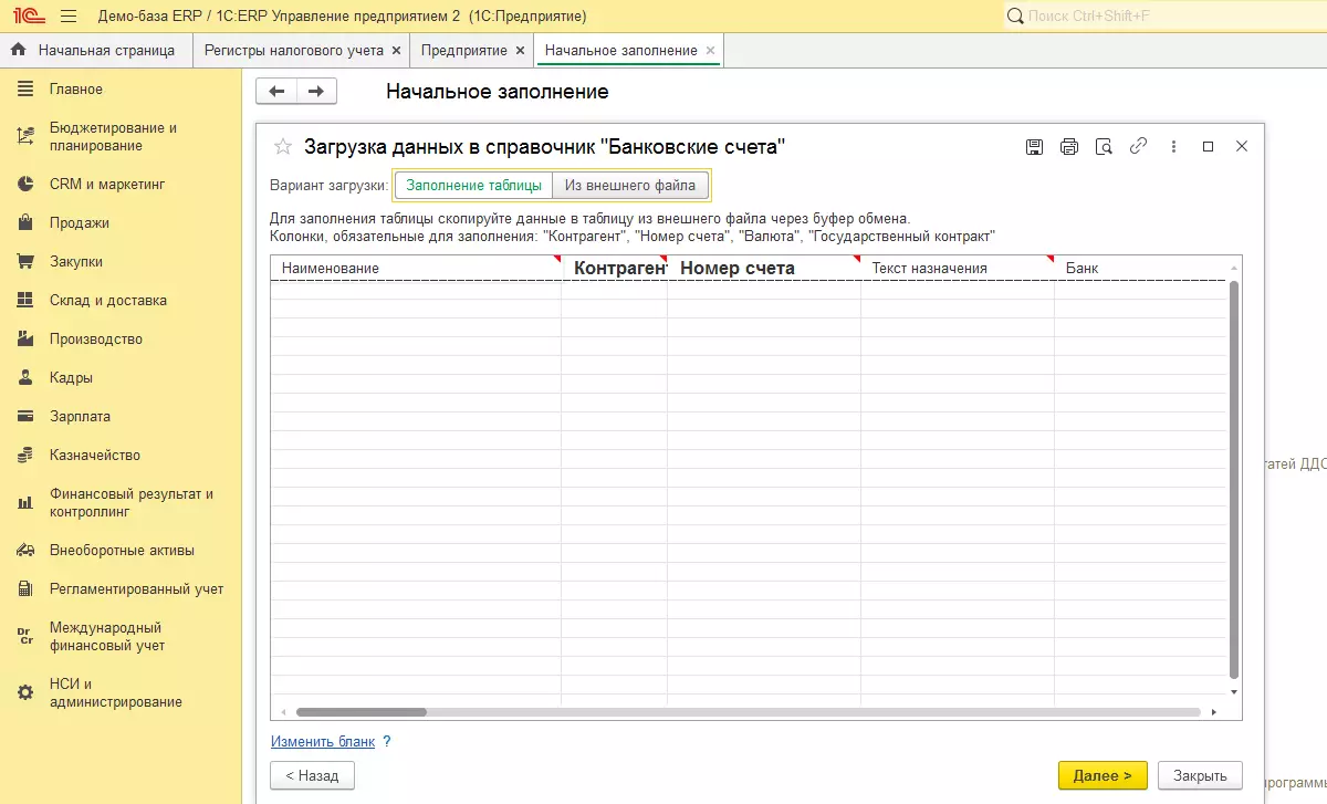Загрузка данных из внешних файлов позволяет внести необходимую информацию в рамках шаблонов ввода. Например, справочник банковский счет может быть загружен при помощи буфера обмена или при помощи шаблона, то есть данные можно выгрузить в виде таблицы формата Excel и в дальнейшем загрузить непосредственно из данного бланка.