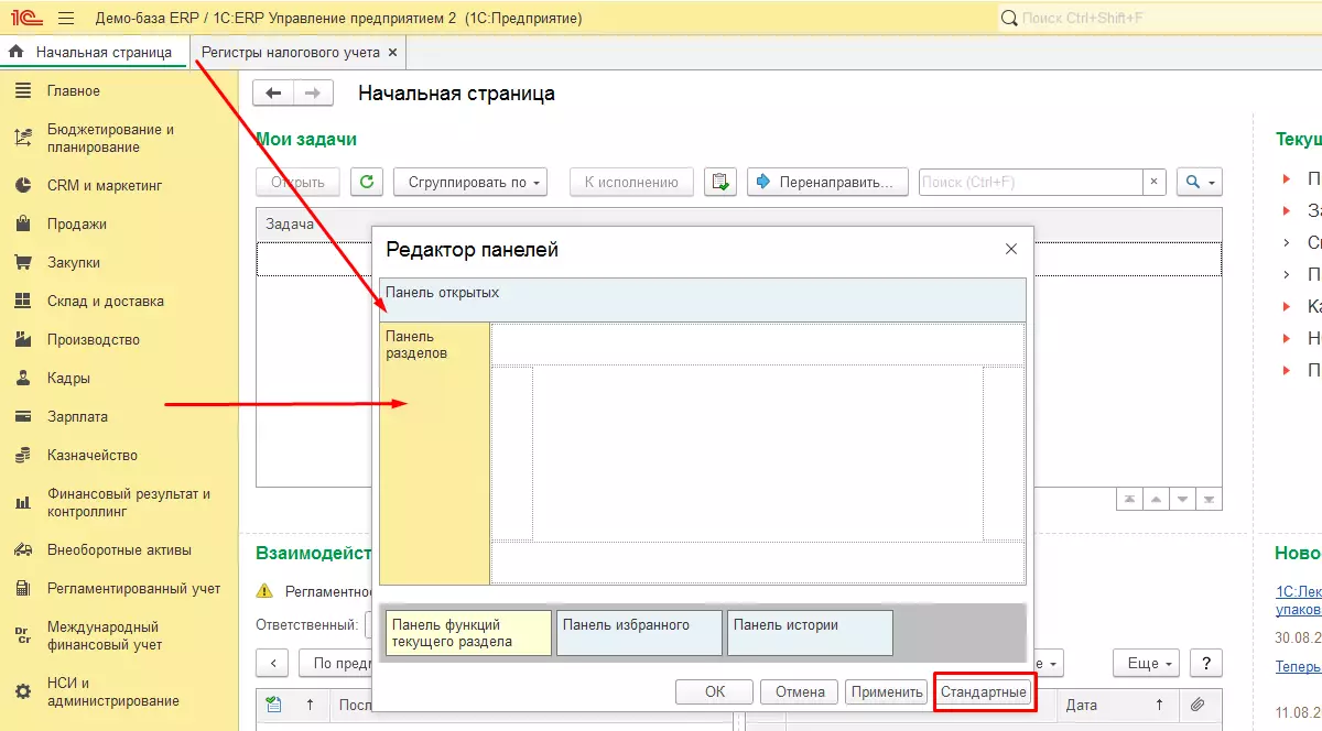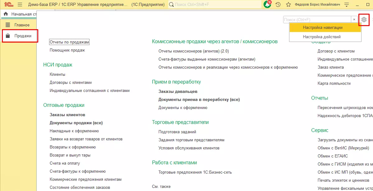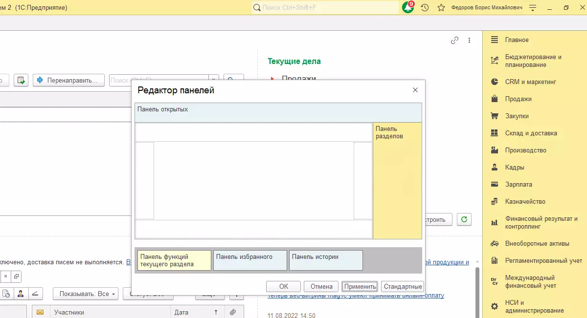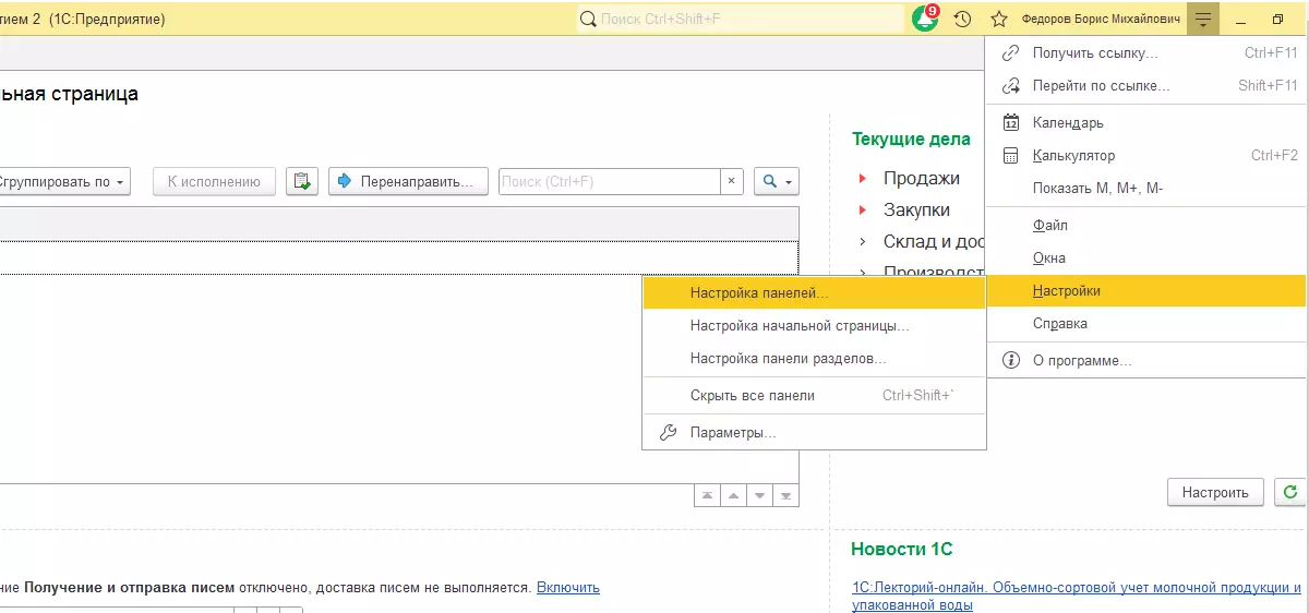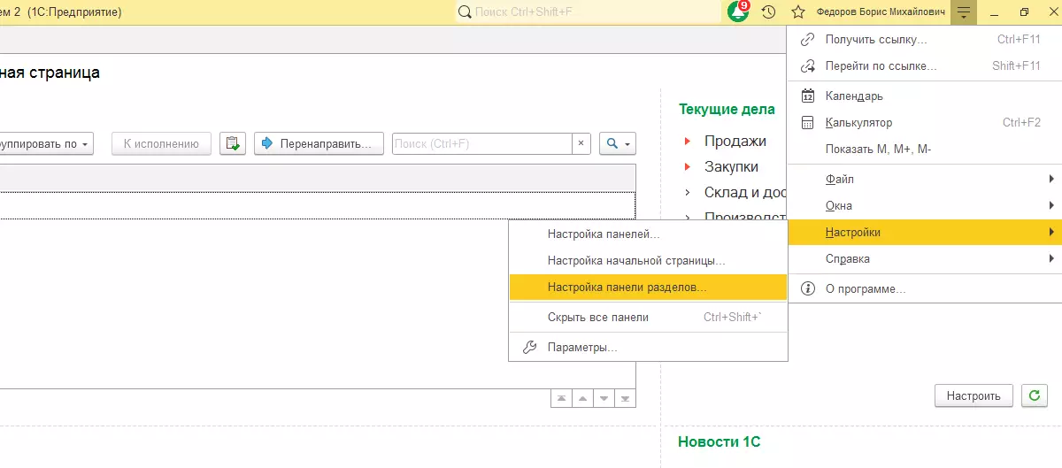 Базовая настройка 1С, форм отчетов/документов, обменов данными, расширений, торг. оборудования и пр.Переходим в Настройка панели разделов.