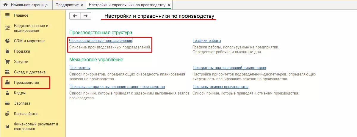 А для отображения подразделений при осуществлении производственных операций необходимо настроить справочник Производственные подразделения, который доступен либо в НСИ и администрирование – НСИ – Структура предприятия, либо через Производство – Настройки и справочники.