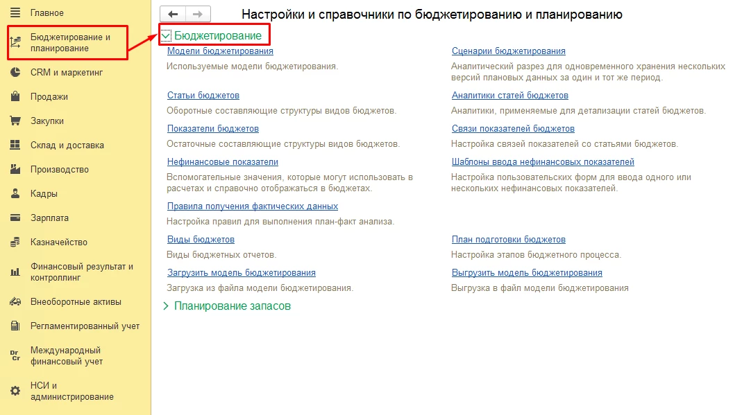 Переходим в раздел Бюджетирование и планирование – Настройки и справочники.