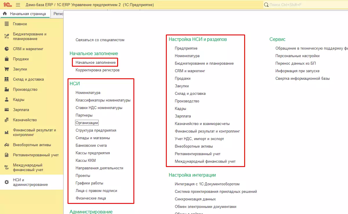 В статье рассматриваем разделы 1С:ERP Управление предприятием 2.5 (1С:ERP 2.5) в части первоначальных настроек программы.
