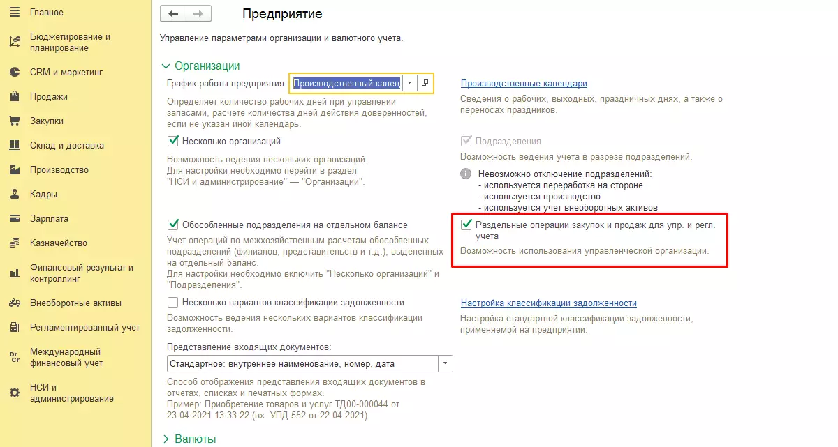 Если несколько организаций, несколько складов, используются расчеты в валюте, то необходимо включить соответствующие опции: Несколько организаций, Несколько валют, Несколько складов.
