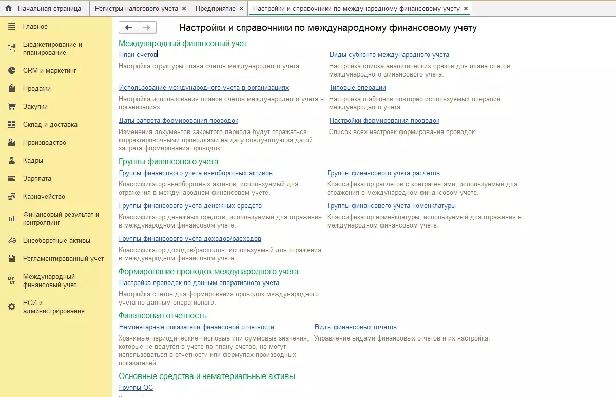 Для этих целей переходим в раздел Международный финансовый учет – Настройки и справочники.