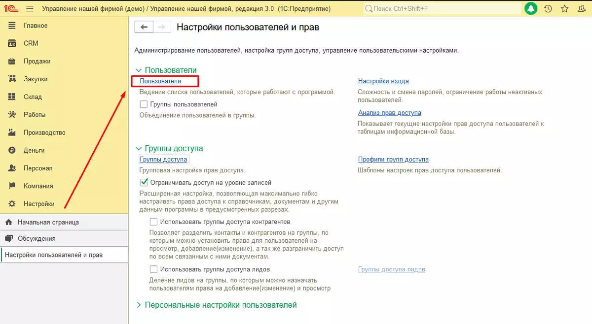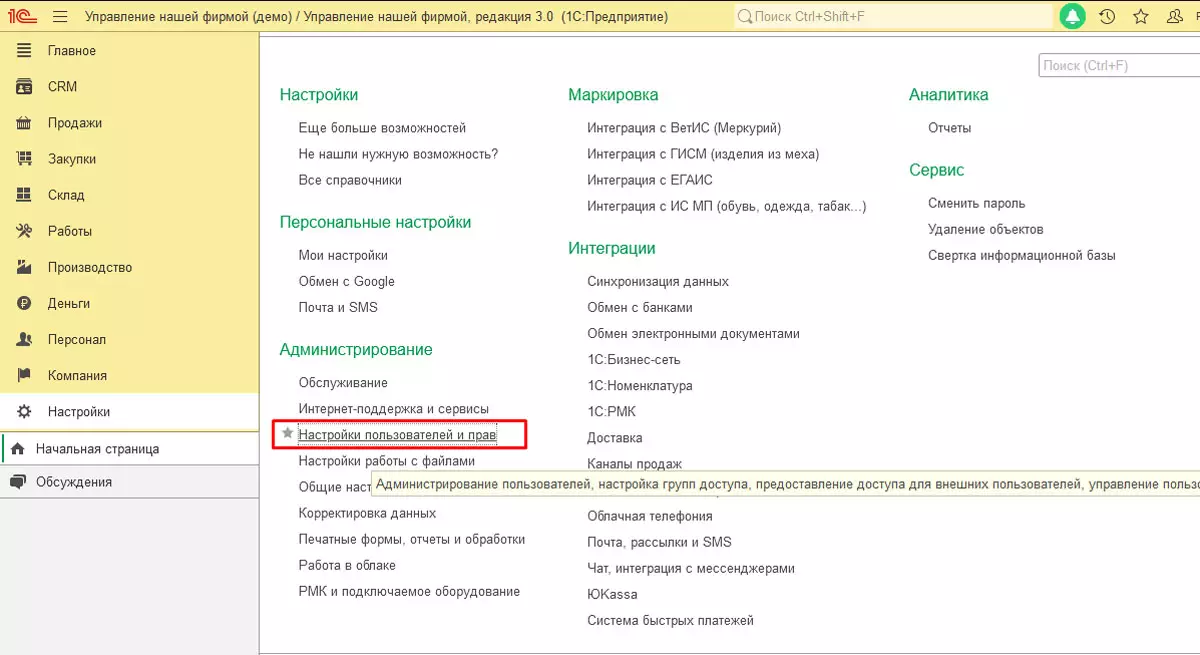 Заходим в раздел Настройки – Администрирование – Настройки пользователей и прав.