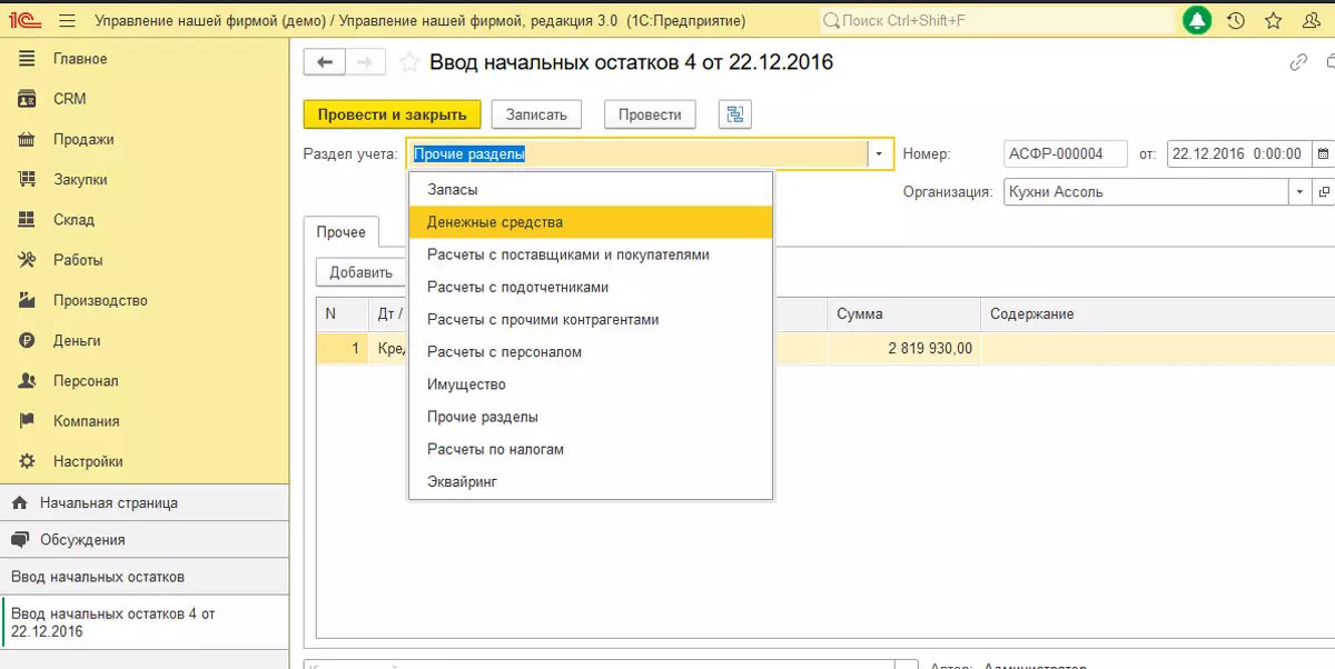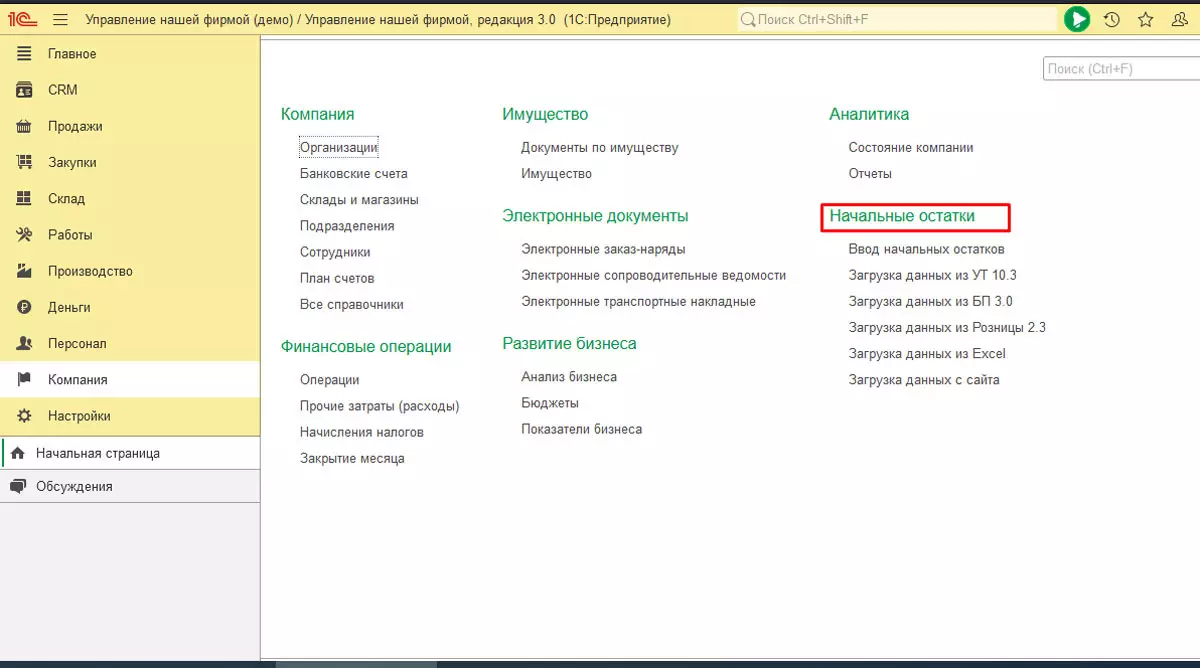 Для этого находим в Компания – Начальные остатки нужный пункт загрузки. Перед этим, соответственно, в предыдущем программном продукте нужно осуществить выгрузку данных.