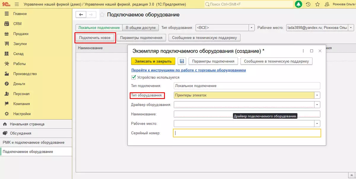 В блоке вы можете добавить рабочее место кассира и подключить любое нужное оборудование. Чтобы его добавить, перейдите по ссылке Подключаемое оборудование, выберите Подключить новое и заполните карточку.