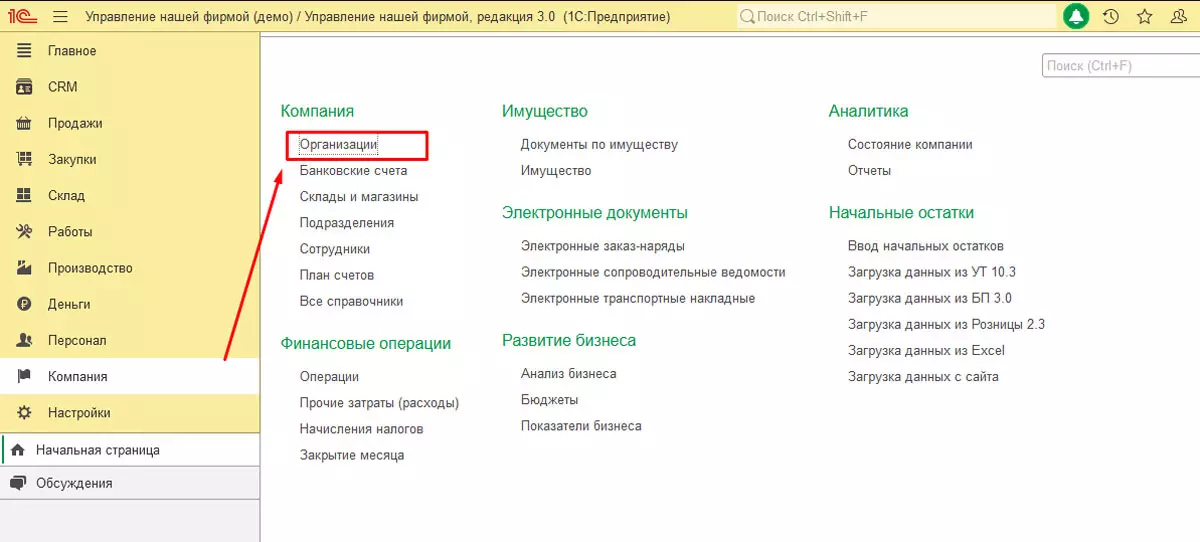 Перед началом работы, как и в любой программе, необходимо выполнить базовую настройку 1С:УНФ. Для этого заходим в раздел Компания - Организации.